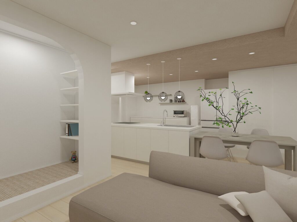 L型にデザインした折り下げ天井とグレージュの色合いが、上質で落ち着いたリビングを演出。