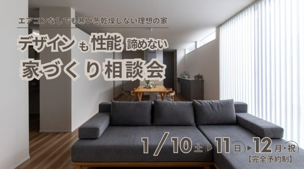 デザインも性能も諦めない。家づくり相談会 〜エアコンなしでも寒くない冬、乾燥しない理想の家〜 「冬はエアコンをつけても足元が寒い」「暖房をつけると空気が乾燥して喉がつらい」「光熱費が高くて、暖かさを我慢している」 そんな … 続きを読む デザインも性能も諦めない。家づくり相談会