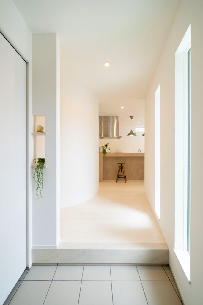 玄関に入るとアール壁とモールテックスがお出迎え😊✨